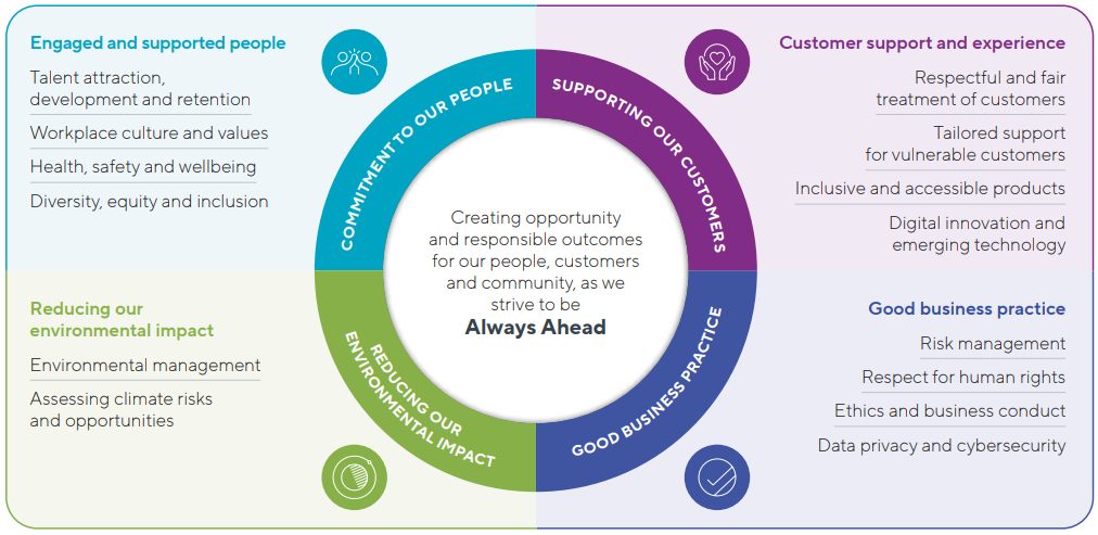 Our Sustainability Framework below sets out our commitment to achieving responsible outcomes for our customers, people, clients, shareholders and the community across four areas.